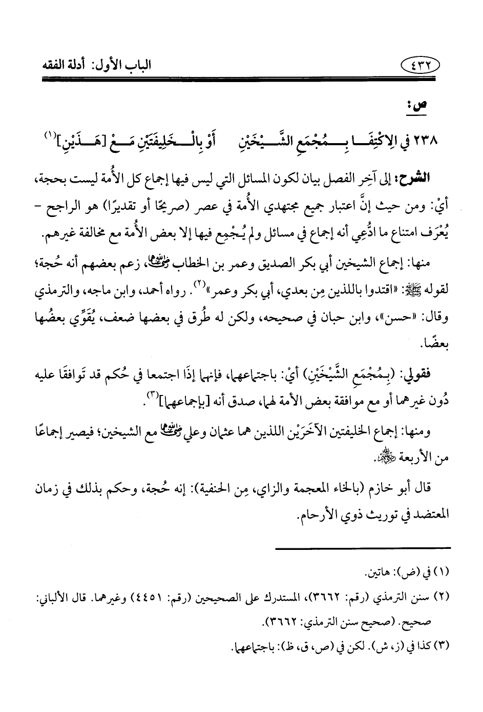 ٢٣٨ - في الِاكْتِفَا بِمُجْمَعِ الشَيْخَيْنِ ... أَوْ بِالْخَلِيفَتين مَعْ [هَذَيْنِ] (¬١)