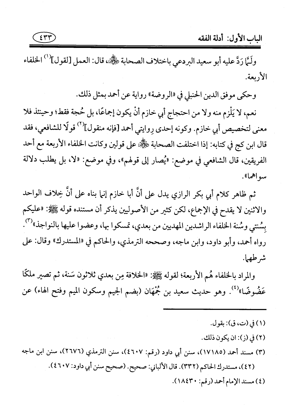 ثم ظاهر كلام أبي بكر الرازي يدل على أنَّ أبا خازم إنما بناه على أنَّ خِلاف الواحد والاثنين لا يقدح في الإجماع، لكن كثير من الأصوليين يذكر أن مستنده قوله - صلى الله عليه وسلم -: "عليكم بِسُنتي وسُنة الخلفاء الراشدين المهديين من بعدي، تمسكوا بها، وعضوا عليها بالنواجذ" (¬٣).