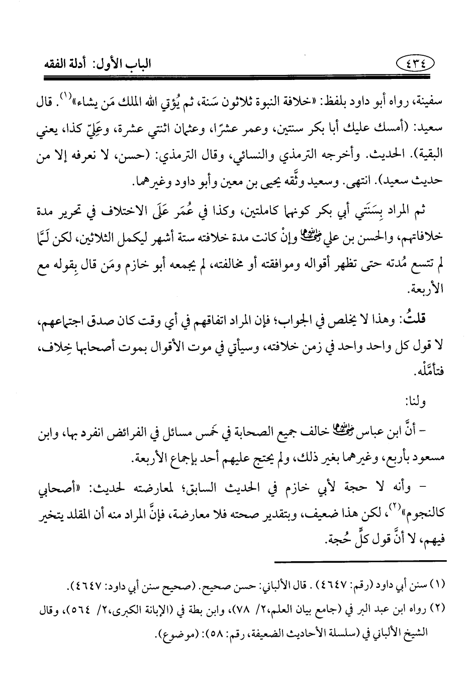 ثم المراد بِسَنَتي أبي بكر كونهما كاملتين، وكذا في عُمَر عَلَى الاختلاف في تحرير مدة خلافاتهم، والحسن بن علي - رضي الله عنهما - وإنْ كانت مدة خلافته ستة أشهر ليكمل الثلاثين، لكن لَمَّا لم تتسع مُدته حتى تظهر أقواله وموافقته أو مخالفته، لم يجمعه أبو خازم ومَن قال بِقوله مع الأربعة.