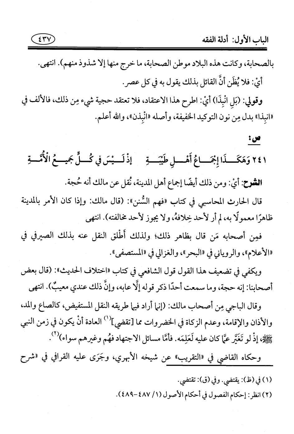 ٢٤١ - وَهَكَذَا إِجْمَاعُ أَهْلِ طَيْبَةِ ... إذْ لَيْسَ في كُلٍّ جَميعُ الْأُمَّةِ