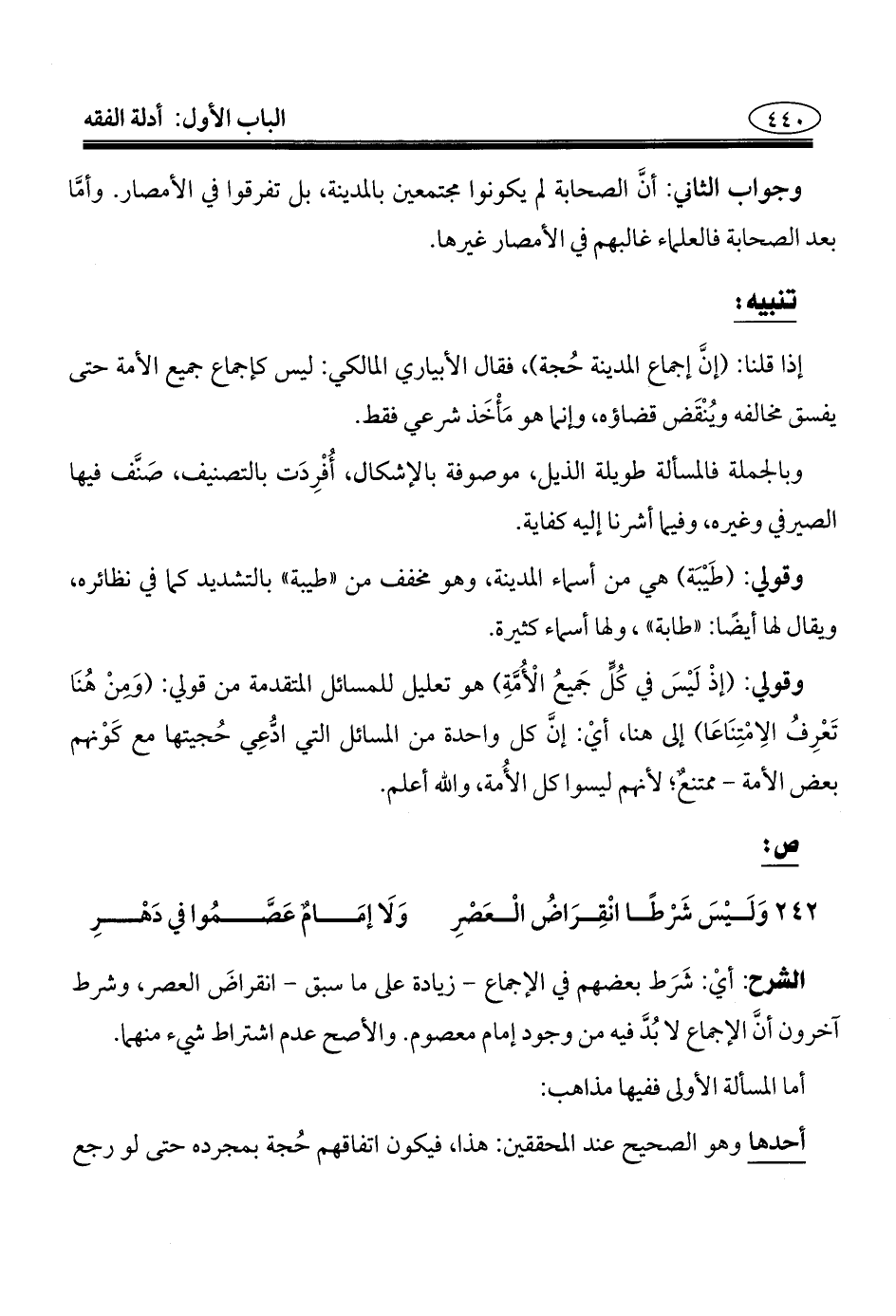وجواب الثاني: أنَّ الصحابة لم يكونوا مجتمعين بالمدينة، بل تفرقوا في الأمصار. وأمَّا بعد الصحابة فالعلماء غالبهم في الأمصار غيرها.