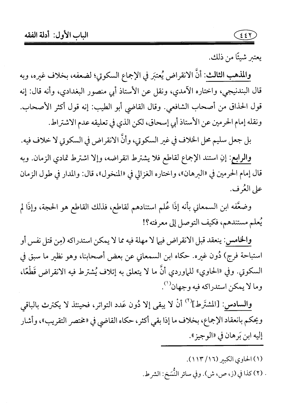 والمذهب الثالث: أنَّ الانقراض يُعتبَر في الإجماع السكوتي؛ لضعفه، بخلاف غيره، وبه قال البندنيجي، واختاره الآمدي، ونقل عن الأستاذ أبي منصور البغدادي، وأنه قال: إنه قول الحذاق من أصحاب الشافعي. وقال القاضي أبو الطيب: إنه قول أكثر الأصحاب. ونقله إمام الحرمين عن الأستاذ أبي إسحاق، لكن الذي في تعليقه عدم الاشتراط.