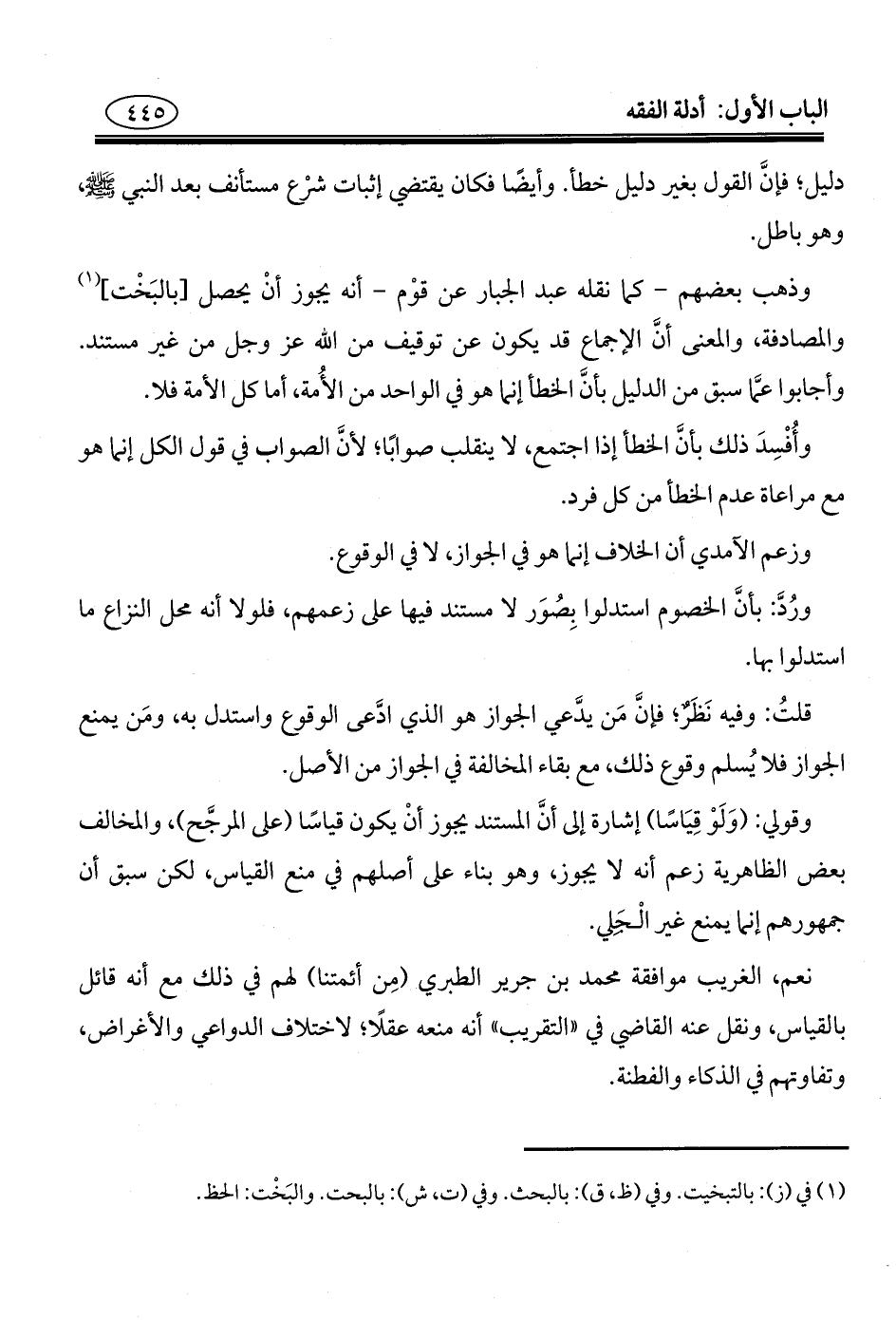 وذهب بعضهم -كما نقله عبد الجبار عن قوْم- أنه يجوز أنْ يحصل [بالبَخْت] (¬١) والمصادفة، والمعنى أنَّ الإجماع قد يكون عن توقيف من الله عَزَّ وَجَلَّ من غير مستند. وأجابوا عمَّا سبق من الدليل بأنَّ الخطأ إنما هو في الواحد من الأُمة، أما كل الأمة فلا.