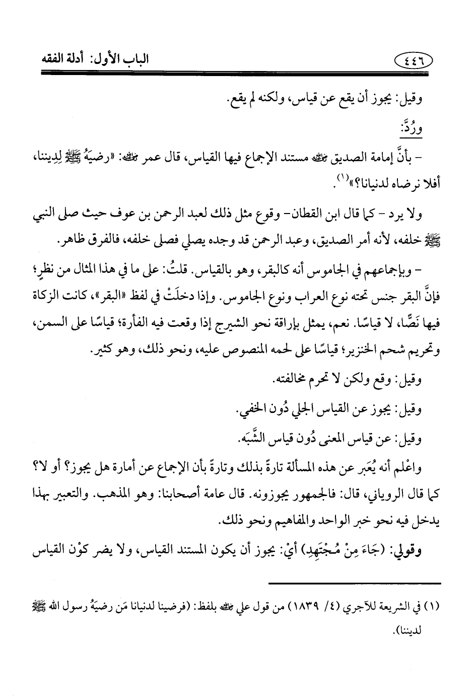 - وبإجماعهم في الجاموس أنه كالبقر، وهو بالقياس. قلتُ: على ما في هذا المثال من نظرٍ؛ فإنَّ البقر جنس تحته نوع العراب ونوع الجاموس. وإذا دخلَتْ في لفظ "البقر"، كانت الزكاة فيها نَصًّا، لا قياسًا. نعم، يمثل بإراقة نحو الشيرج إذا وقعت فيه الفأرة؛ قياسًا على السمن، وتحريم شحم الخنزير؛ قياسًا على لحمه المنصوص عليه، ونحو ذلك، وهو كثير.