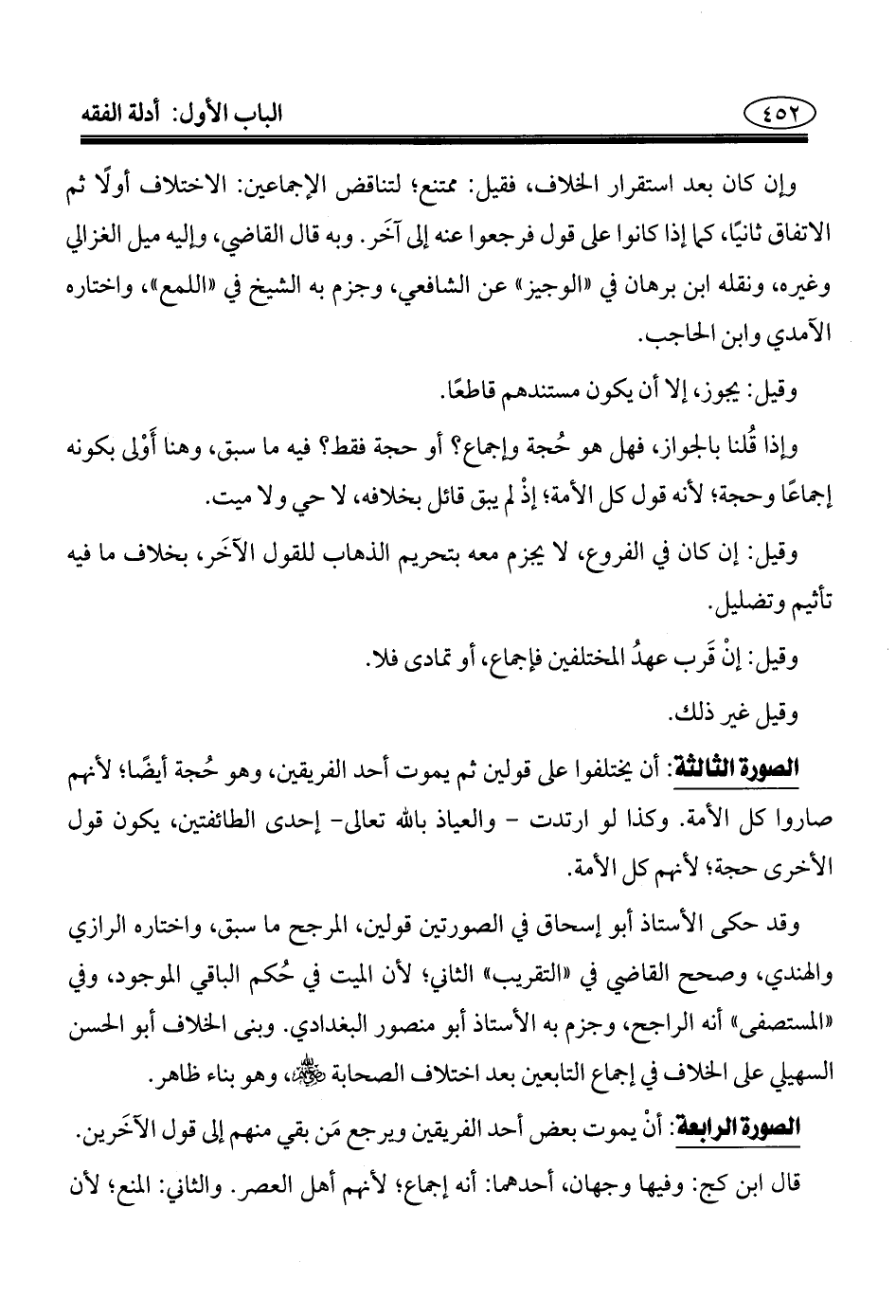 الصورة الثالثة: أن يختلفوا على قولين ثم يموت أحد الفريقين، وهو حُجة أيضًا؛ لأنهم صاروا كل الأمة. وكذا لو ارتدت - والعياذ بالله تعالى- إحدى الطائفتين، يكون قول الأخرى حجة؛ لأنهم كل الأمة.