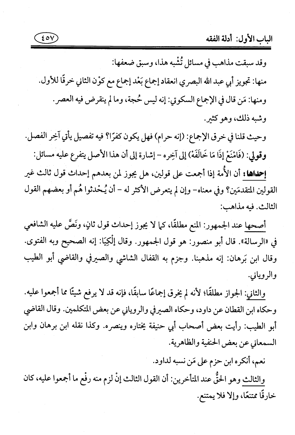 والثالث وهو الحقُّ عند المتأخرين: أن القول الثالث إنْ لزم منه رفْع ما أجمعوا عليه، كان خارقًا ممتنعًا، وإلا فلا يمتنع.