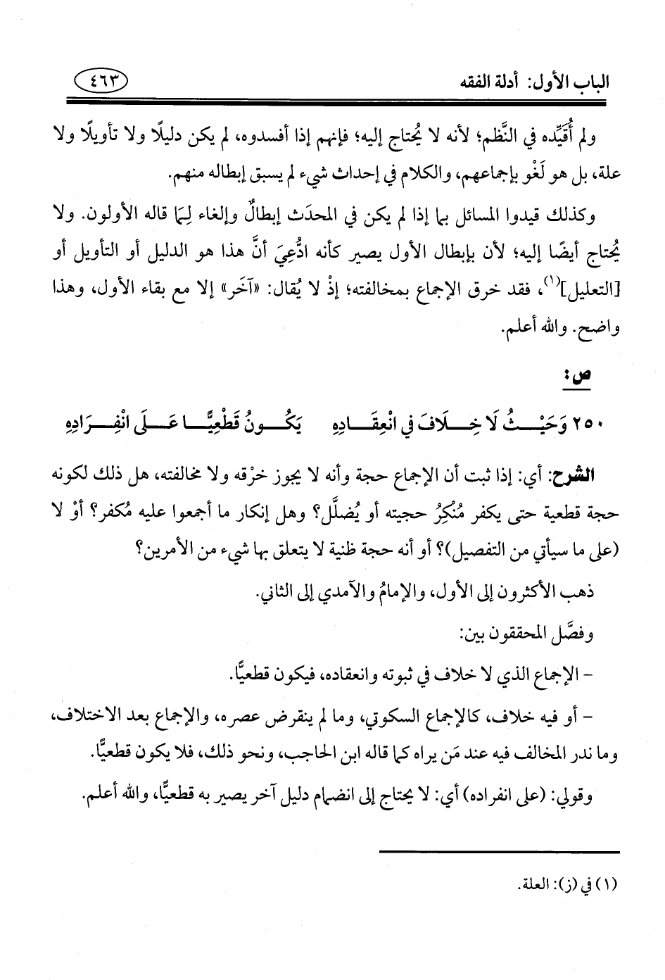 ٢٥٠ - وَحَيْثُ لَا خِلَافَ في انْعِقَادِهِ ... يَكُونُ قَطْعِيًّا عَلَى انْفِرَادِهِ