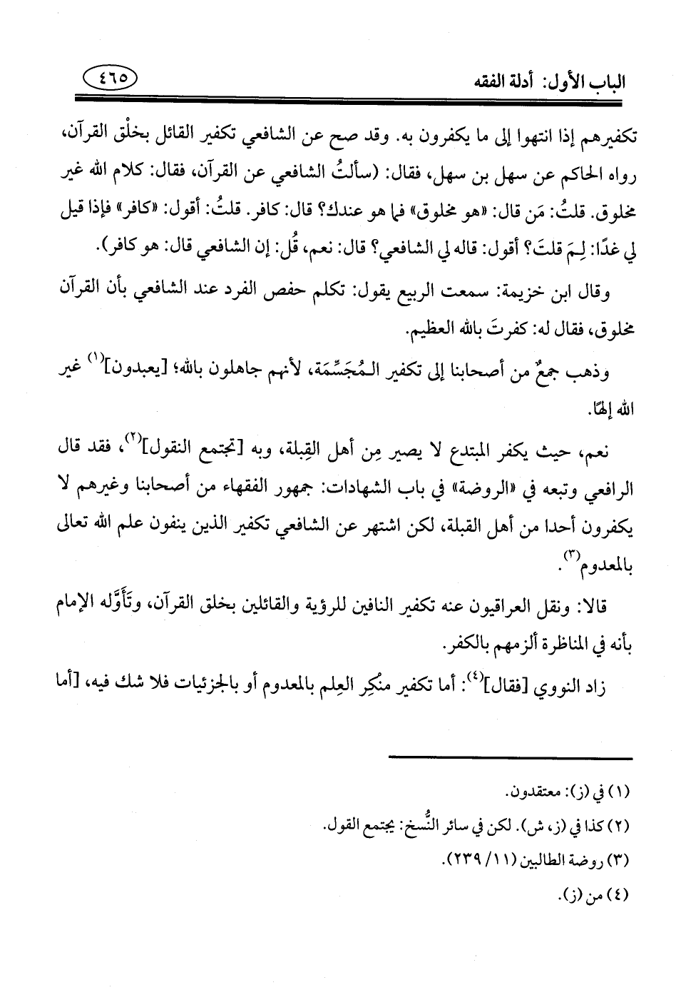 تكفيرهم إذا انتهوا إلى ما يكفرون به. وقد صح عن الشافعي تكفير القائل بخلْق القرآن، رواه الحاكم عن سهل بن سهل، فقال: (سألتُ الشافعي عن القرآن، فقال: كلام الله غير مخلوق. قلتُ: مَن قال: "هو مخلوق" ففي هو عندك؟ قال: كافر. قلتُ: أقول: "كافر" فإذا قيل لي غدًا: لِمَ قلتَ؟ أقول: قاله لي الشافعي؟ قال: نعم، قُل: إن الشافعي قال: هو كافر).
