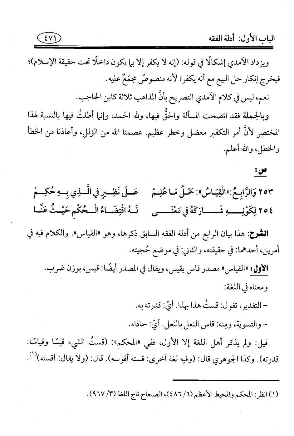 ٢٥٣ - وَالرَّابِعُ: "الْقِيَاسُ": حَمْلُ مَا عُلِمْ ... عَلَى نَظِيرٍ في الَّذِي بِهِ حُكِمْ