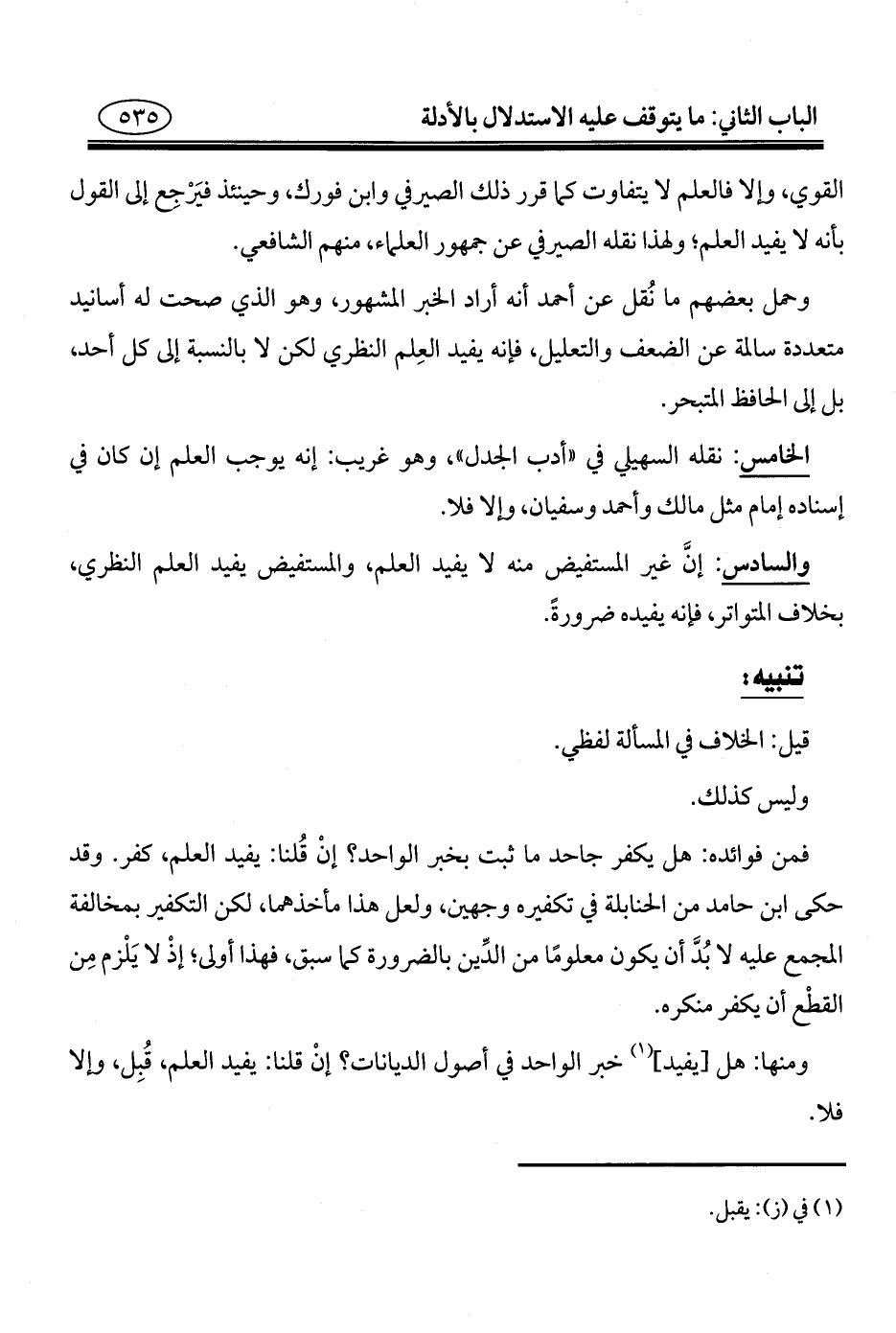 الخامس: نقله السهيلي في "أدب الجدل"، وهو غريب: إنه يوجب العلم إن كان في إسناده إمام مثل مالك وأحمد وسفيان، وإلا فلا.