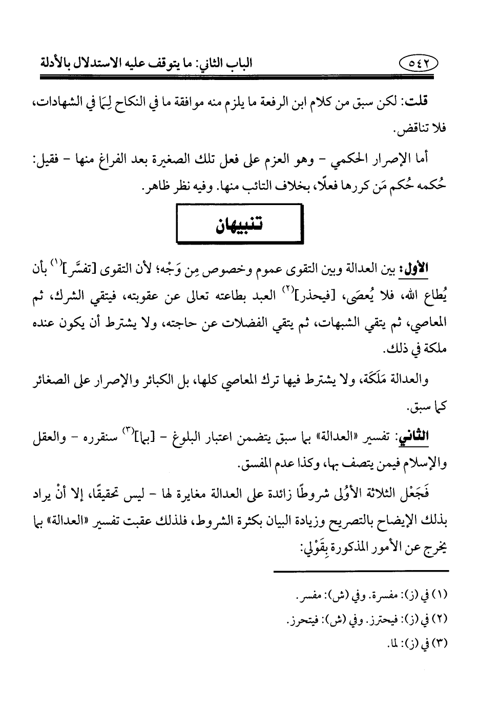 فَجَعْل الثلاثة الأوُلى شروطًا زائدة على العدالة مغايرة لها - ليس تحقيقًا، إلا أنْ يراد بذلك الإيضاح بالتصريح وزيادة البيان بكثرة الشروط، فلذلك عقبت تفسير "العدالة" بما يخرج عن الأمور المذكورة بِقَوْلي: