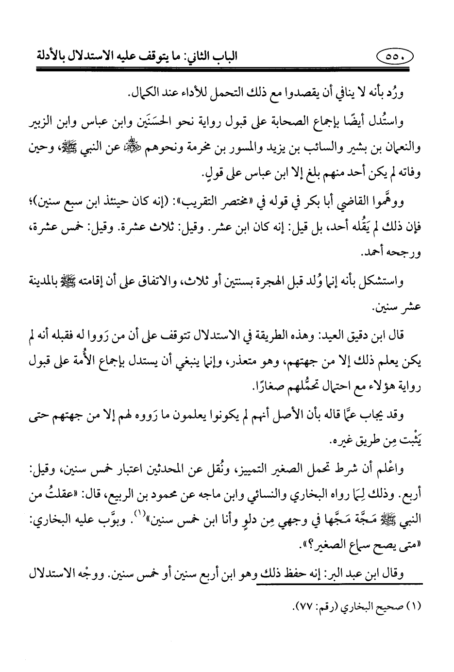 واستُدل أيضًا بإجماع الصحابة على قبول رواية نحو الحسَنَين وابن عباس وابن الزبير والنعمان بن بشير والسائب بن يزيد والمسور بن مخرمة ونحوهم - رضي الله عنهم - عن النبي - صلى الله عليه وسلم -، وحين وفاته لم يكن أحد منهم بلغ إلا ابن عباس على قولٍ.
