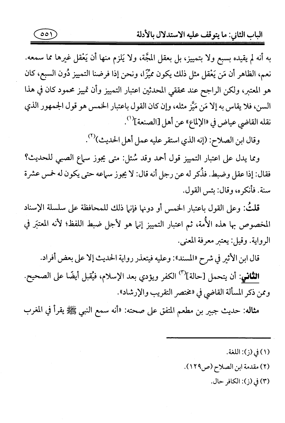 ومما يدل على اعتبار التمييز قول أحمد وقد سُئل: متى يجوز سماع الصبي للحديث؟ فقال: إذا عقل وضبط. فذُكر له عن رجل أنه قال: لا يجوز سماعه حتى يكون له خمس عشرة سنة. فأنكره، وقال: بئس القول.