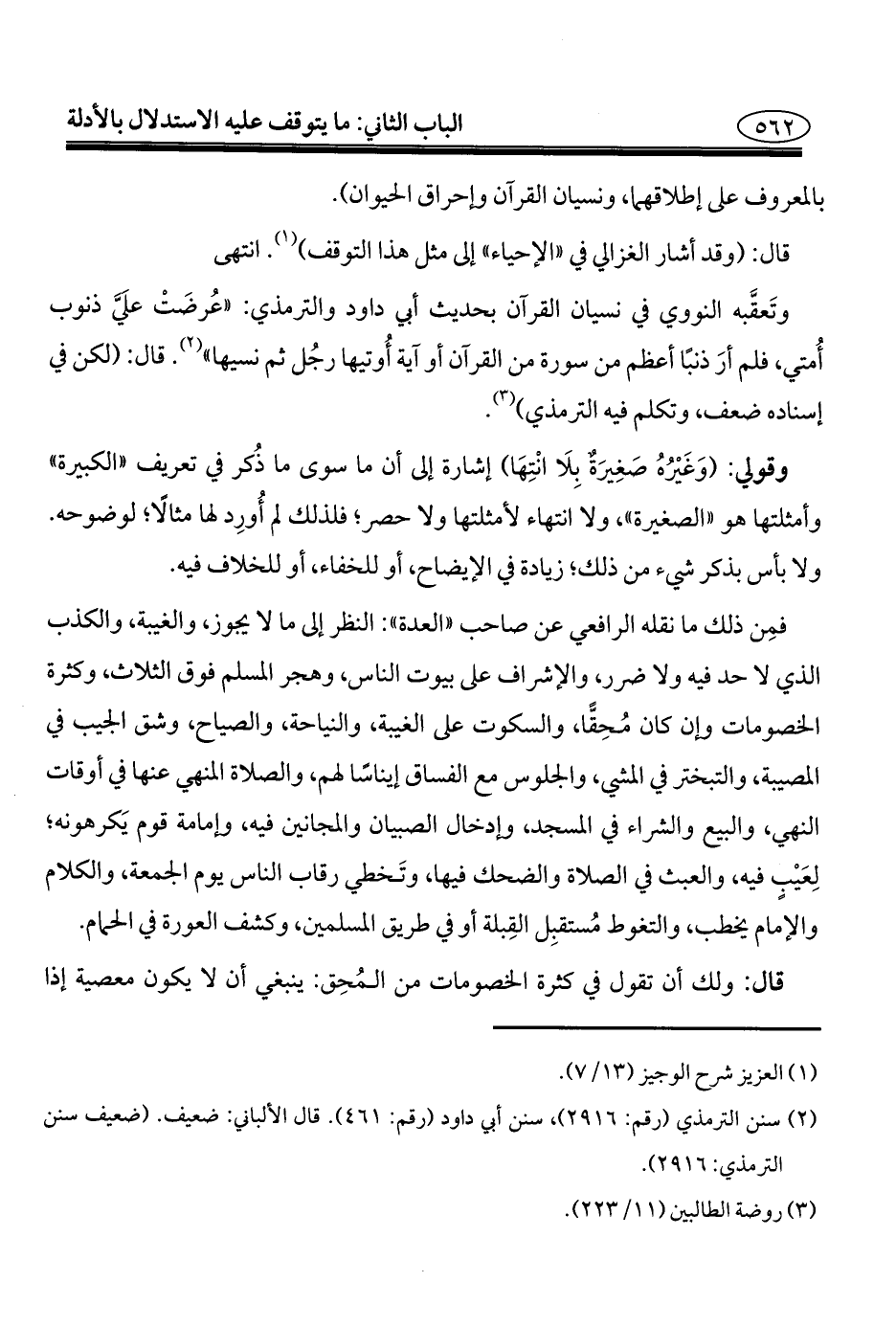 انتهى وتَعقَّبه النووي في نسيان القرآن بحديث أبي داود والترمذي: "عُرضَتْ علَيَّ ذنوب أُمتي، فلم أرَ ذنبًا أعظم من سورة من القرآن أو آية أُوتيها رجُل ثم نسيها" (¬٢). قال: (لكن في إسناده ضعف، وتكلم فيه الترمذي) (¬٣).