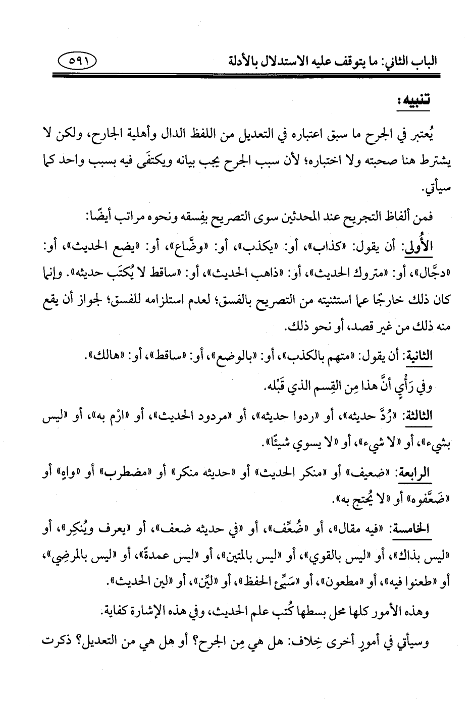 الخامسة: "فيه مقال"، أو "ضُعِّف"، أو "في حديثه ضعف"، أو"يعرف ويُنكِر"، أو "ليس بذاك"، أو "ليس بالقوي"، أو "ليس بالمتين"، أو "ليس عمدةً"، أو"ليس بالمرضِي"، أو "طعنوا فيه"، أو "مطعون"، أو "سَيِّئ الحفظ"، أو "ليِّن"، أو "لين الحديث".
