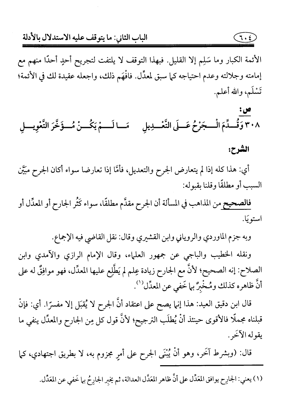 ٣٠٨ - وَقُدِّمَ الْجَرْحُ عَلَى التَّعْدِيلِ ... مَا لَمْ يَكُنْ مُؤَخَّرَ التَّعْوِيلِ
