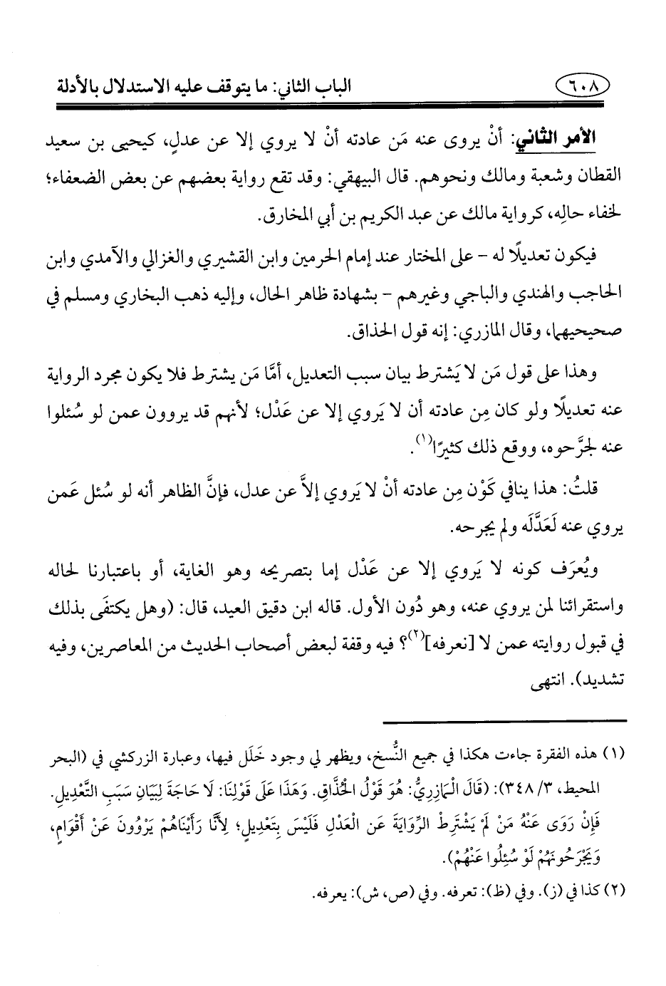 الأمر الثاني: أنْ يروى عنه مَن عادته أنْ لا يروي إلا عن عدلٍ، كيحيى بن سعيد القطان وشعبة ومالك ونحوهم. قال البيهقي: وقد تقع رواية بعضهم عن بعض الضعفاء؛ لخفاء حالِه، كرواية مالك عن عبد الكريم بن أبي المخارق.