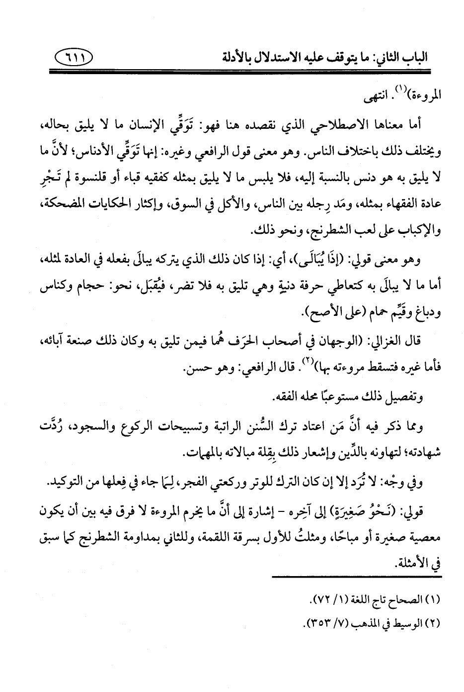 أما معناها الاصطلاحي الذي نقصده هنا فهو: تَوَقِّي الإنسان ما لا يليق بحاله، ويختلف ذلك باختلاف الناس. وهو معنى قول الرافعي وغيره: إنها تَوَقِّي الأدناس؛ لأنَّ ما لا يليق به هو دنس بالنسبة إليه، فلا يلبس ما لا يليق بمثله كفقيه قباء أو قلنسوة لم تَجْرِ عادة الفقهاء بمثله، ومَد رِجله بين الناس، والأكل في السوق، وإكثار الحكايات المضحكة، والإكباب على لعب الشطرنج، ونحو ذلك.