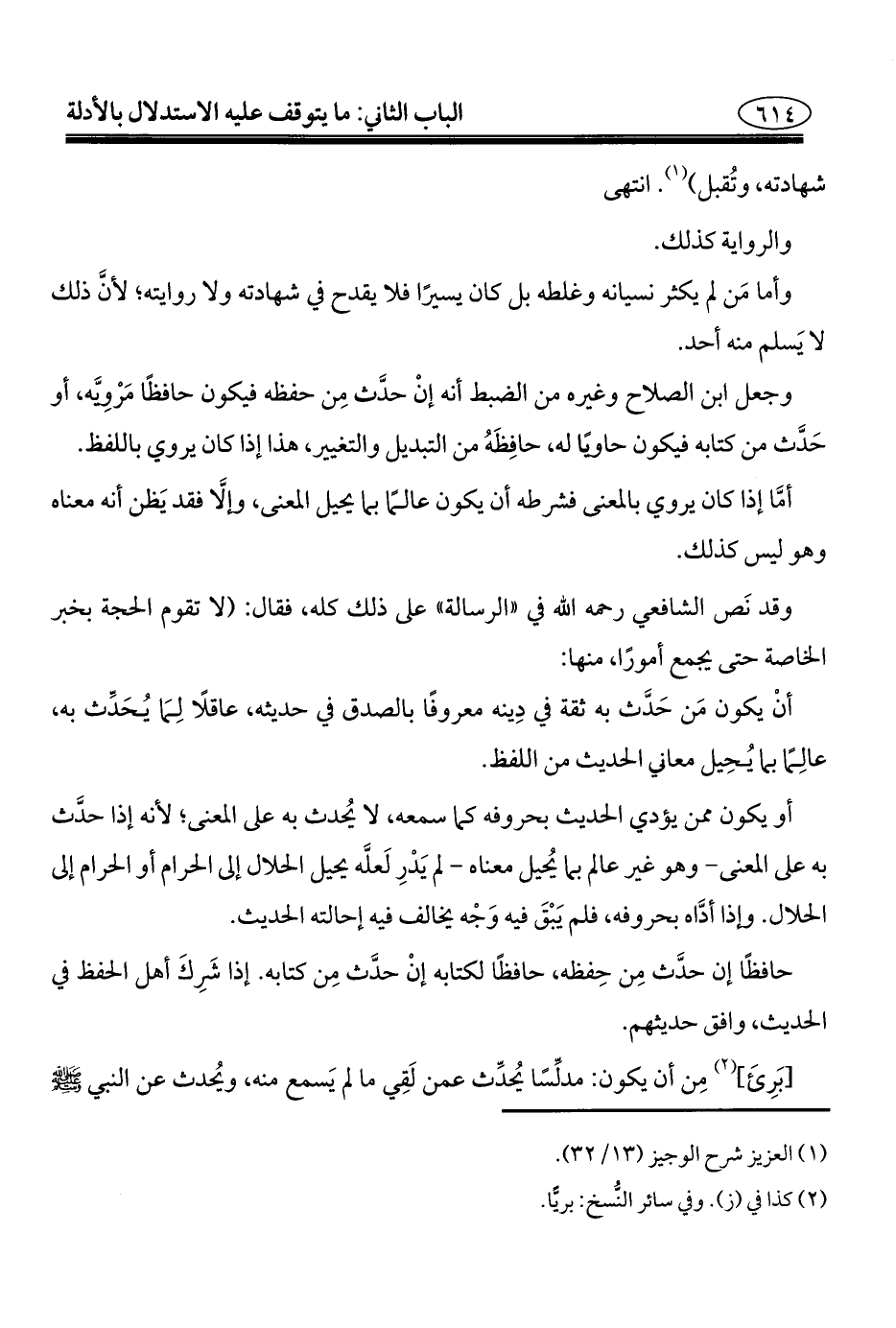 أو يكون ممن يؤدي الحديث بحروفه كما سمعه، لا يُحدث به على المعنى؛ لأنه إذا حدَّث به على المعنى -وهو غير عالم بما يُحيل معناه- لم يَدْرِ لَعلَّه يحيل الحلال إلى الحرام أو الحرام إلى الحلال. وإذا أدَّاه بحروفه، فلم يَبْقَ فيه وَجْه يخالف فيه إحالته الحديث.