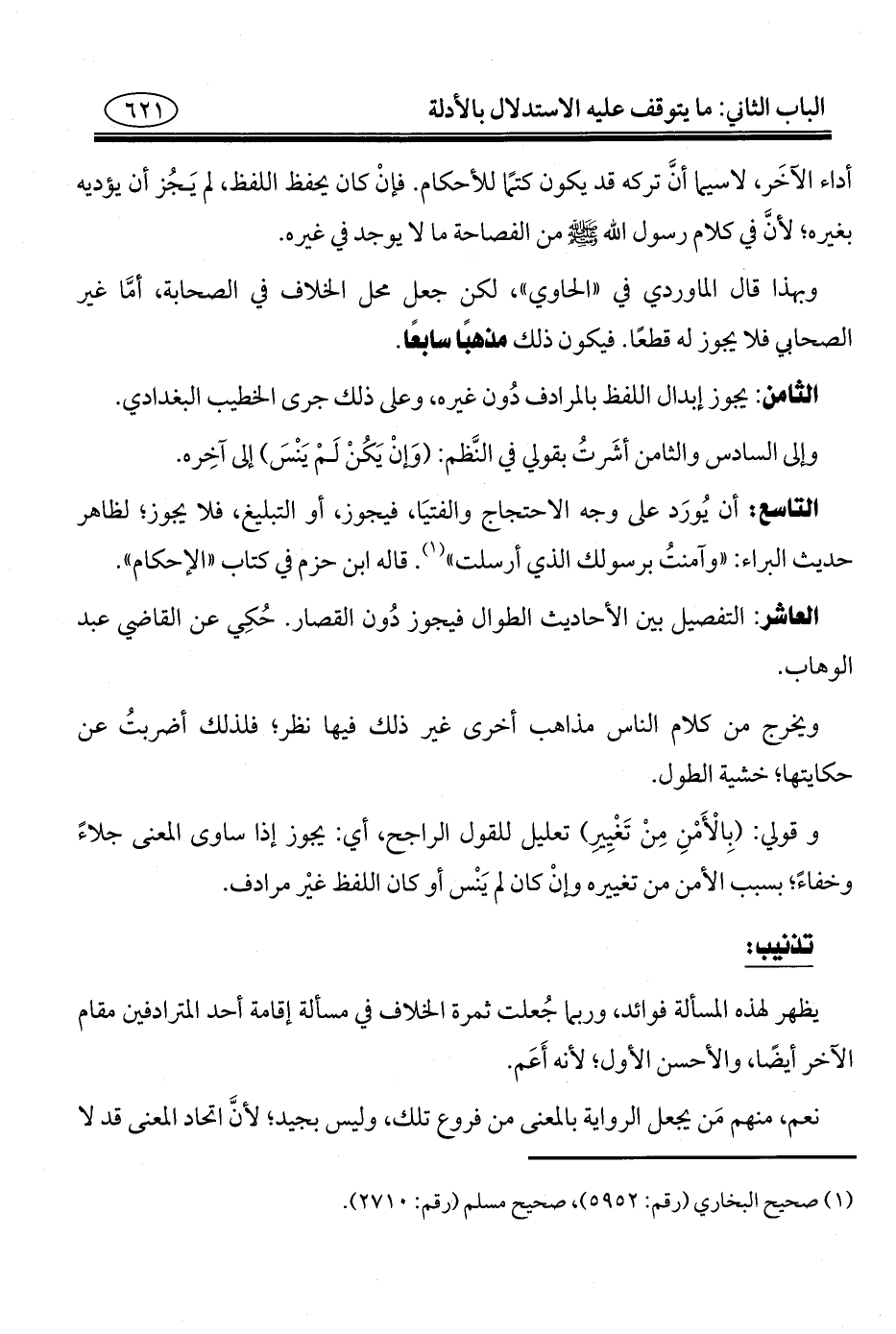 أداء الآخَر، لاسيما أنَّ تركه قد يكون كتمًا للأحكام. فإنْ كان يحفظ اللفظ، لم يَجُز أن يؤديه بغيره؛ لأنَّ في كلام رسول الله - صلى الله عليه وسلم - من الفصاحة ما لا يوجد في غيره.