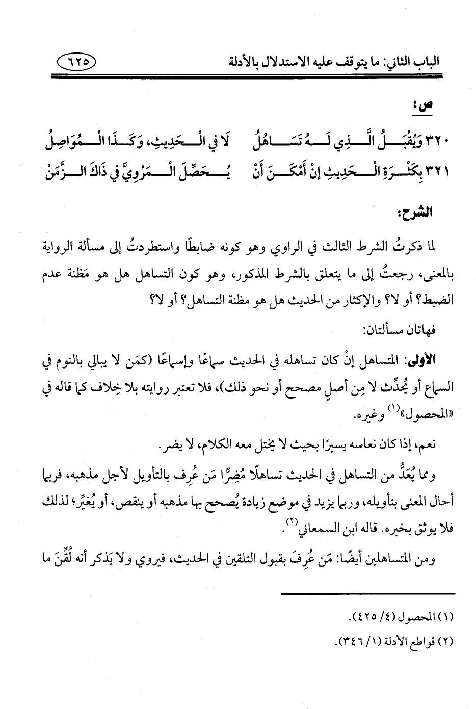 ٣٢٠ - وَيُقْبَلُ الَّذِي لَهُ تَسَاهُلُ ... لَا في الْحَدِيثِ، وَكَذَا الْمُوَاصِلُ