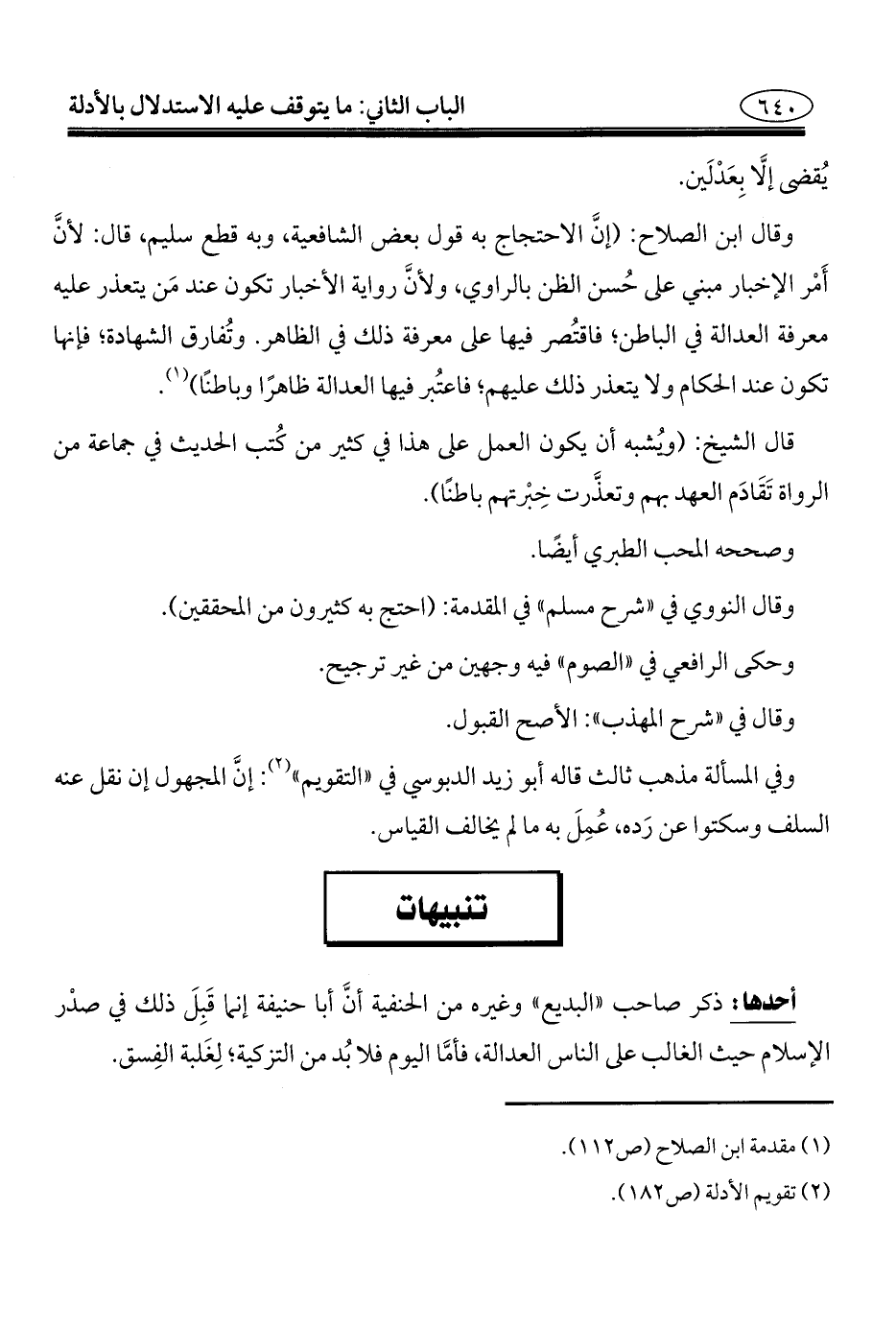 وقال ابن الصلاح: (إنَّ الاحتجاج به قول بعض الشافعية، وبه قطع سليم، قال: لأنَّ أَمْر الإخبار مبني على حُسن الظن بالراوي، ولأنَّ رواية الأخبار تكون عند مَن يتعذر عليه معرفة العدالة في الباطن؛ فاقتُصر فيها على معرفة ذلك في الظاهر. وتُفارق الشهادة؛ فإنها تكون عند الحكام ولا يتعذر ذلك عليهم؛ فاعتُبر فيها العدالة ظاهرًا وباطنًا) (¬١).