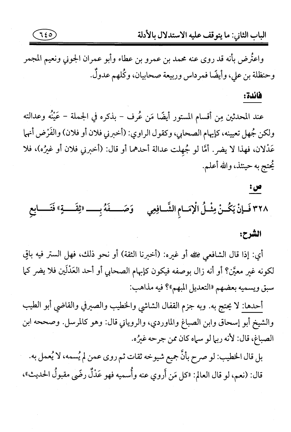 ٣٢٨ - فَإنْ يَكُنْ مِثْلُ الْإمَامِ الشَّافِعِي ... وَصَفَهُ بِـ "ثِقَةٍ" فَتَابِعِ