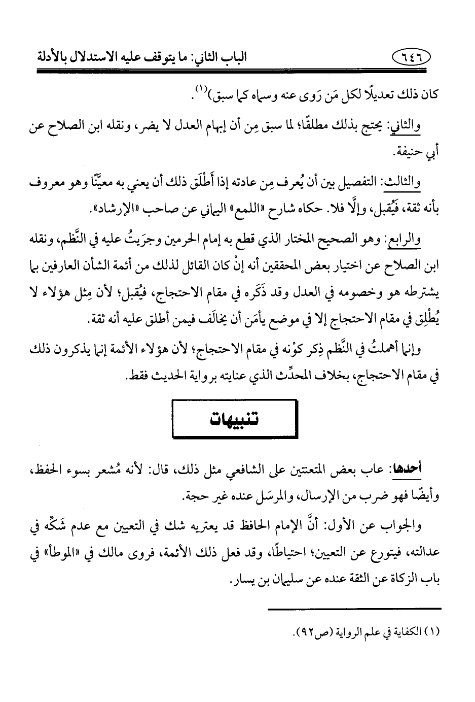 الرابع: وهو الصحيح المختار الذي قطع به إمام الحرمين وجرَيتُ عليه في النَّظم، ونقله ابن الصلاح عن اختيار بعض المحققين أنه إنْ كان القائل لذلك من أئمة الشأن العارفين بما يشترطه هو وخصومه في العدل وقد ذَكَره في مقام الاحتجاج، فيُقبل؛ لأن مِثل هؤلاء لا يُطْلِق في مقام الاحتجاج إلا في موضع يأمَن أن يخالَف فيمن أطلق عليه أنه ثقة.