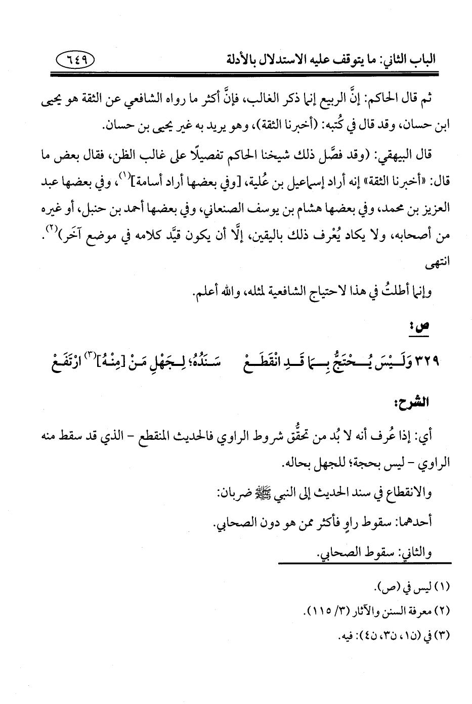 ٣٢٩ - وَلَيْسَ يُحْتَجُّ بِمَا قَدِ انْقَطَعْ ... سَنَدُهُ؛ لِجَهْلِ مَنْ [مِنْهُ] (¬٣) ارْتَفَعْ