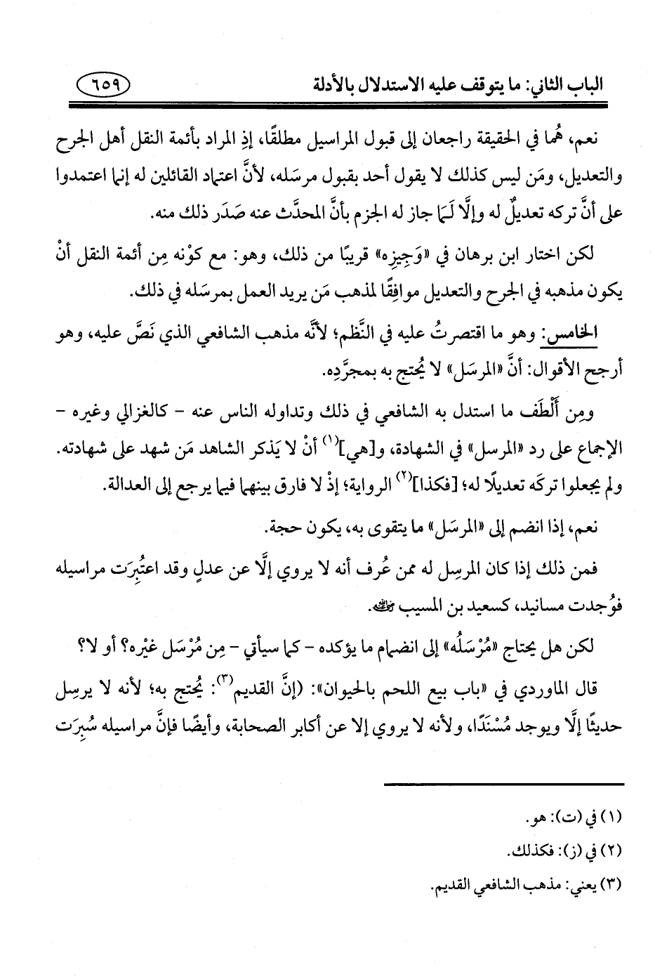 الخامس: وهو ما اقتصرتُ عليه في النَّظم؛ لأنَّه مذهب الشافعي الذي نَصَّ عليه، وهو أرجح الأقوال: أنَّ "المرسَل" لا يُحتج به بمجرَّدِه.