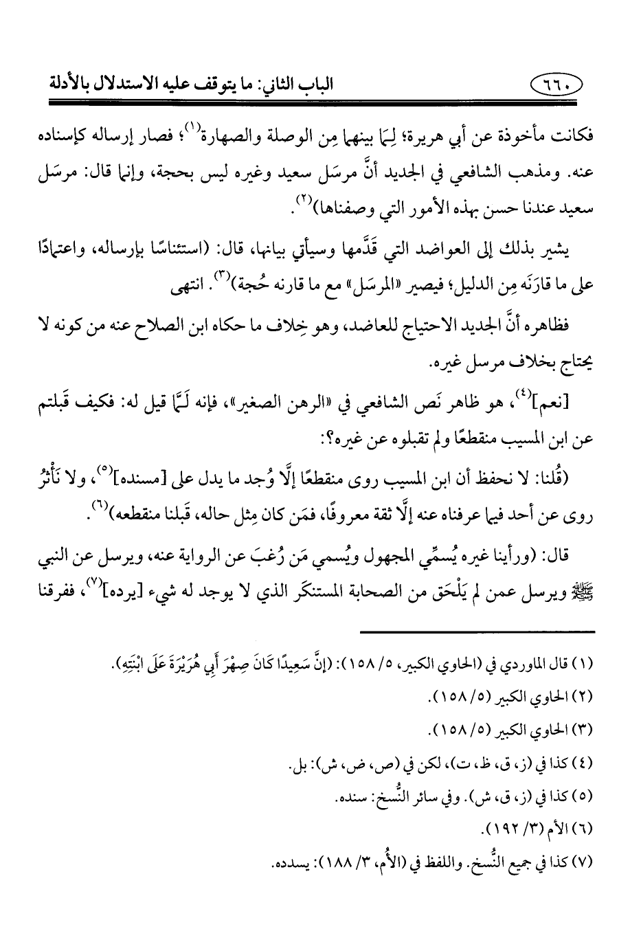 فكانت مأخوذة عن أبي هريرة؛ لِمَا بينهما مِن الوصلة والصهارة (¬١)؛ فصار إرساله كإسناده عنه. ومذهب الشافعي في الجديد أنَ مرسَل سعيد وغيره ليس بحجة، وإنما قال: مرسَل سعيد عندنا حسن بهذه الأمور التي وصفناها) (¬٢).