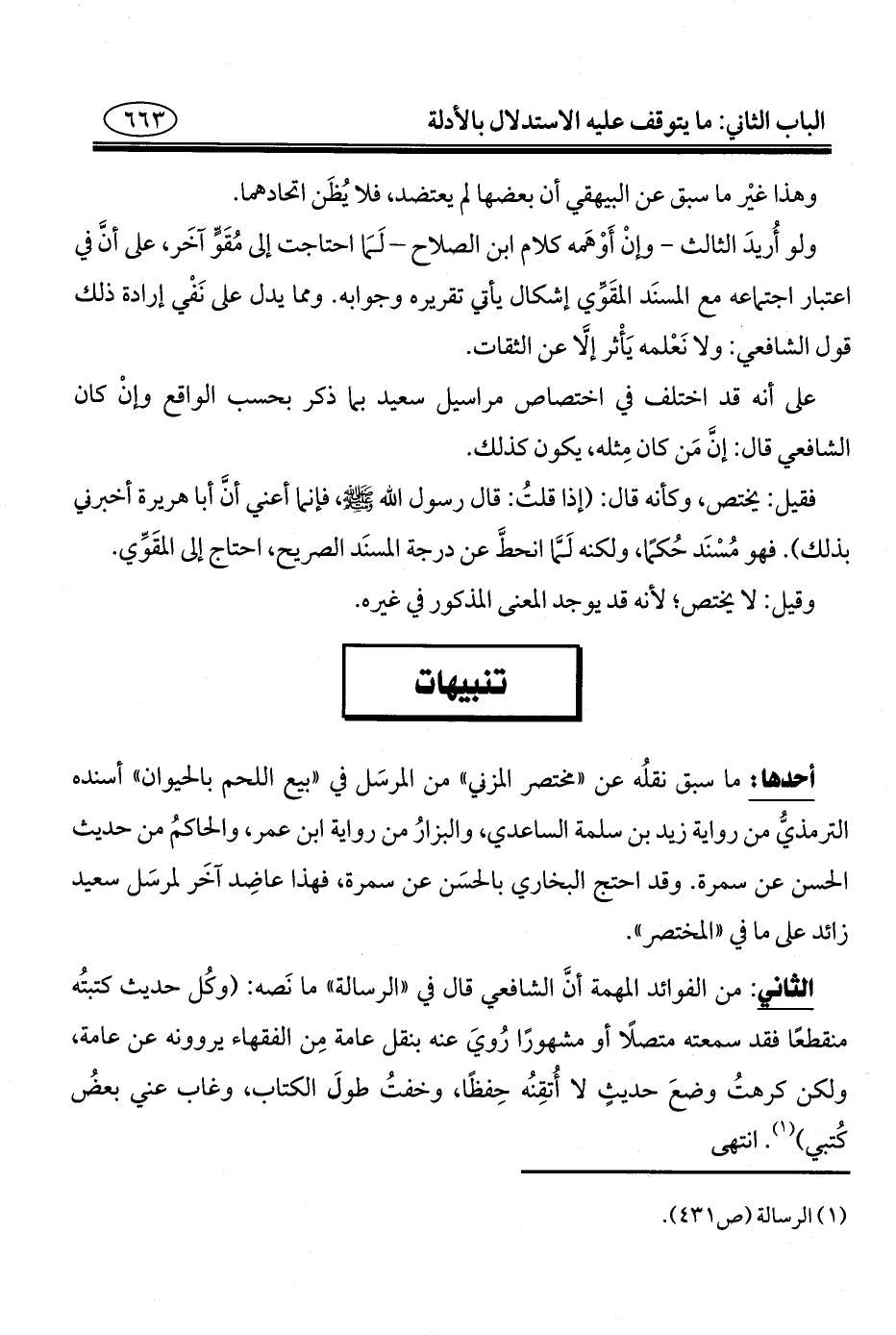 ولو أُريدَ الثالث -وإنْ أَوْهَمه كلام ابن الصلاح- لَمَا احتاجت إلى مُقَوٍّ آخَر، على أنَّ في اعتبار اجتماعه مع المسنَد المقَوِّي إشكال يأتي تقريره وجوابه. ومما يدل على نَفْي إرادة ذلك قول الشافعي: ولا نَعْلمه يَأْثر إلَّا عن الثقات.