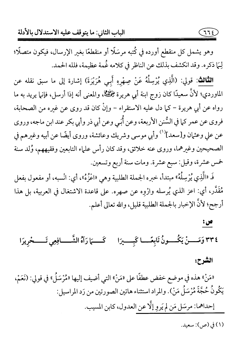 الثالث: قولي: (الَّذِي يُرْسِلُهُ عَنْ صِهْرِهِ أَبِي هُرَيْرَةَ) إشارة إلى ما سبق نقله عن الماوردي؛ لأنَّ سعيدًا كان زوج ابنة أبي هريرة - رضي الله عنه -، والمعنى أنه إذا أرسل، فإنما يريد به ما رواه عن أبي هريرة -كما دل عليه الاستقراء- وإنْ كان قد روى عن غيره من الصحابة، فروى عن عمر كما في السُّنن الأربعة، وعن أُبَي وعن أبي ذر وأبي بكر عند ابن ماجه، وروى عن علي وعثمان و [سعد] (¬١) وأبي موسى وشريك وعائشة، وروى أيضًا عن أبيه وغيرهم في الصحيحين وغيرهما، وروى عنه خلائق، وقد كان رأس علماء التابعين وفقيههم، وُلد سنة خمس عشرة، وقيل: سبع عشرة. ومات سنة أربع وتسعين.
