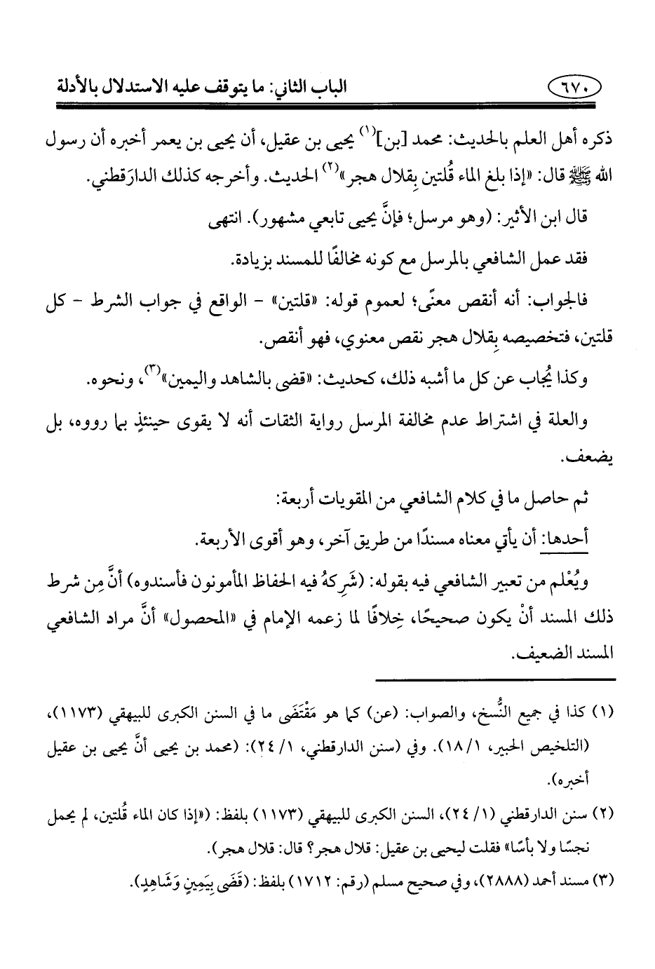 (¬٢) سنن الدارقطني (١/ ٢٤)، السنن الكبرى للبيهقي (١١٧٣) بلفظ: ("إذا كان الماء قُلتين، لم يحمل نجسًا ولا بأسًا" فقلت ليحيى بن عقيل: قلال هجر؟ قال: قلال هجر).