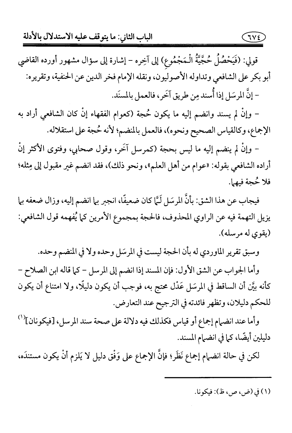 - وإنْ لم يسند وانضم إليه ما يكون حُجة (كعوام الفقهاء إنْ كان الشافعي أراد به الإجماع، وكالقياس الصحيح ونحوه)، فالعمل بالمنضم؛ لأنه حُجة على استقلاله.
