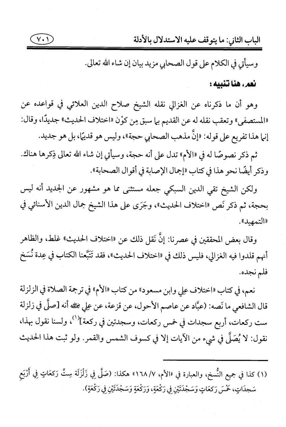 ولكن الشيخ تقي الدين السبكي جعله مستثنى مما هو مشهور عن الجديد أنه ليس بحجة، ثم ذكر نَص "اختلاف الحديث"، وجَرَى على هذا الشيخ جمال الدين الأسنائي في "التمهيد".