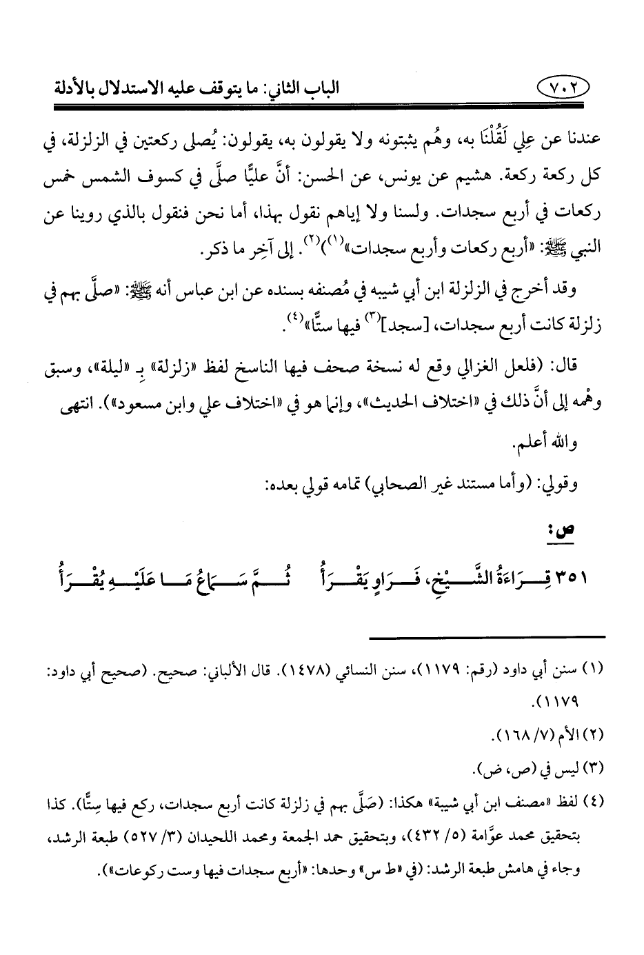 (¬٤) لفظ "مصنف ابن أبي شيبة" هكذا: (صَلَّى بهم في زلزلة كانت أربع سجدات، ركع فيها سِتًّا). كذا بتحقيق محمد عوَّامة (٥/ ٤٣٢)، وبتحقيق حمد الجمعة ومحمد اللحيدان (٣/ ٥٢٧) طبعة الرشد، وجاء في هامش طبعة الرشد: (في "ط س" وحدها: "أربع سجدات فيها وست ركوعات").