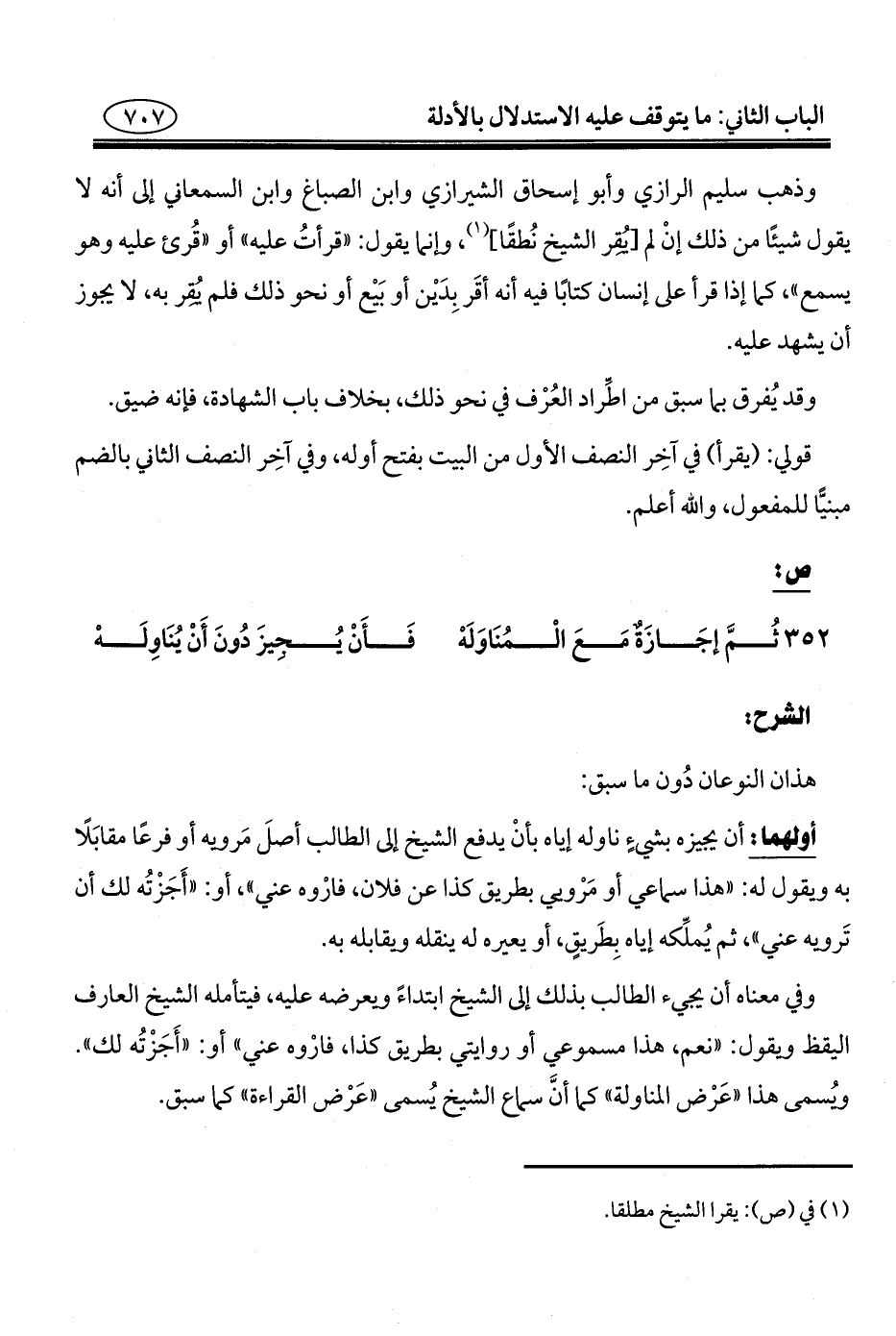 وفي معناه أن يجيء الطالب بذلك إلى الشيخ ابتداءً ويعرضه عليه، فيتأمله الشيخ العارف اليقظ ويقول: "نعم، هذا مسموعي أو روايتي بطريق كذا، فارْوه عني" أو: "أَجَزْتُه لك". ويُسمى هذا "عَرْض المناولة" كما أنَّ سماع الشيخ يُسمى "عَرْض القراءة" كما سبق.