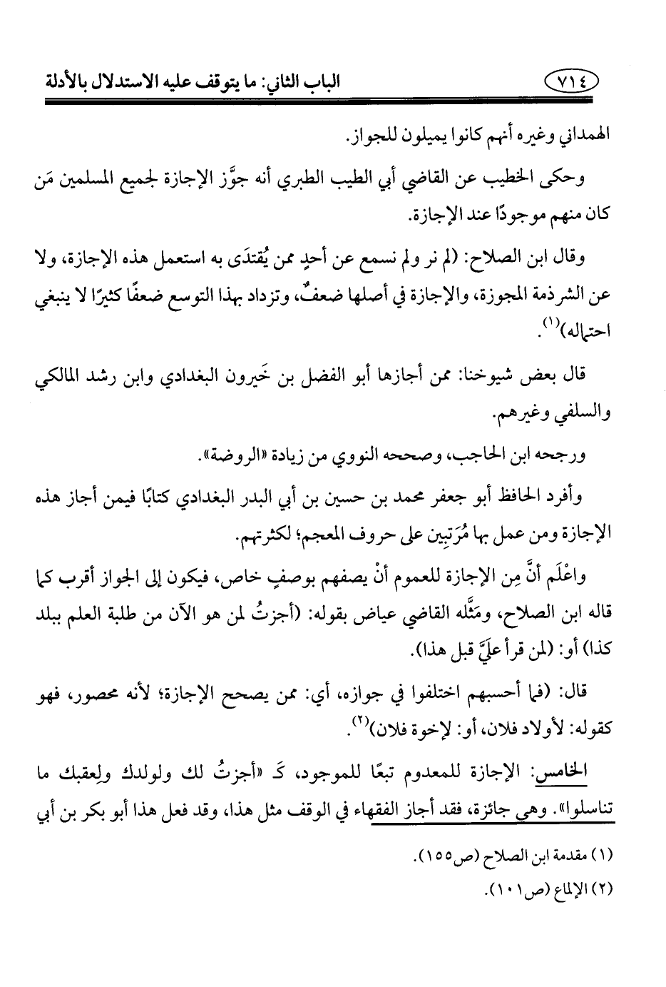 واعْلَم أنَّ مِن الإجازة للعموم أنْ يصفهم بوصفٍ خاص، فيكون إلى الجواز أقرب كما قاله ابن الصلاح، ومَثَّله القاضي عياض بقوله: (أجزتُ لمن هو الآن من طلبة العلم ببلد كذا) أو: (لمن قرأ علَيَّ قبل هذا).