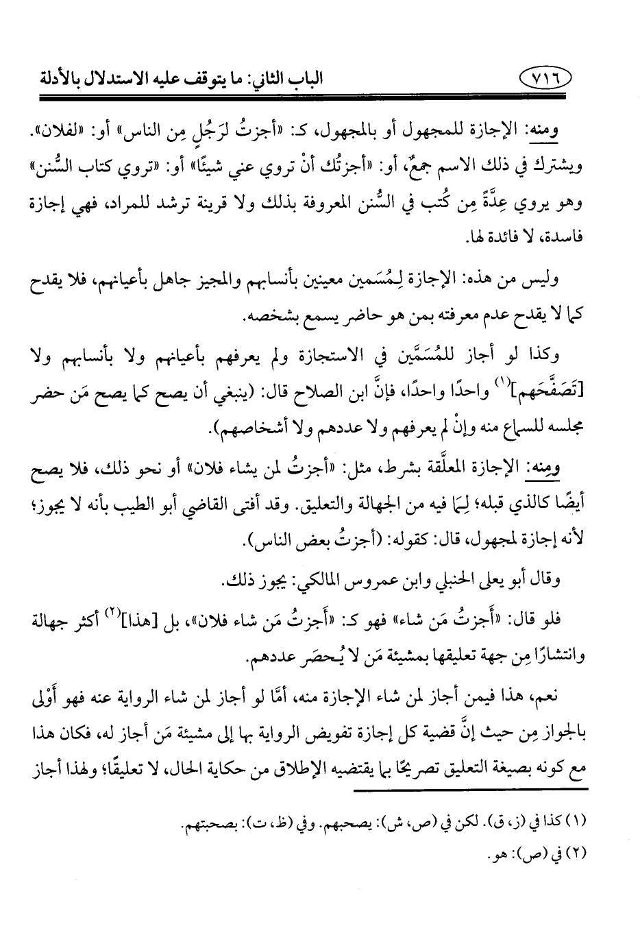 ومنه: الإجازة للمجهول أو بالمجهول، كـ: "أجزتُ لرَجُلٍ مِن الناس" أو: "لفلان". ويشترك في ذلك الاسم جمع، أو: "أجزتُك أنْ تروي عني شيئًا" أو: "تروي كتاب السُّنن " وهو يروي عِدَّةً مِن كُتب في السُّنن المعروفة بذلك ولا قرينة ترشد للمراد، فهي إجازة فاسدة، لا فائدة لها.
