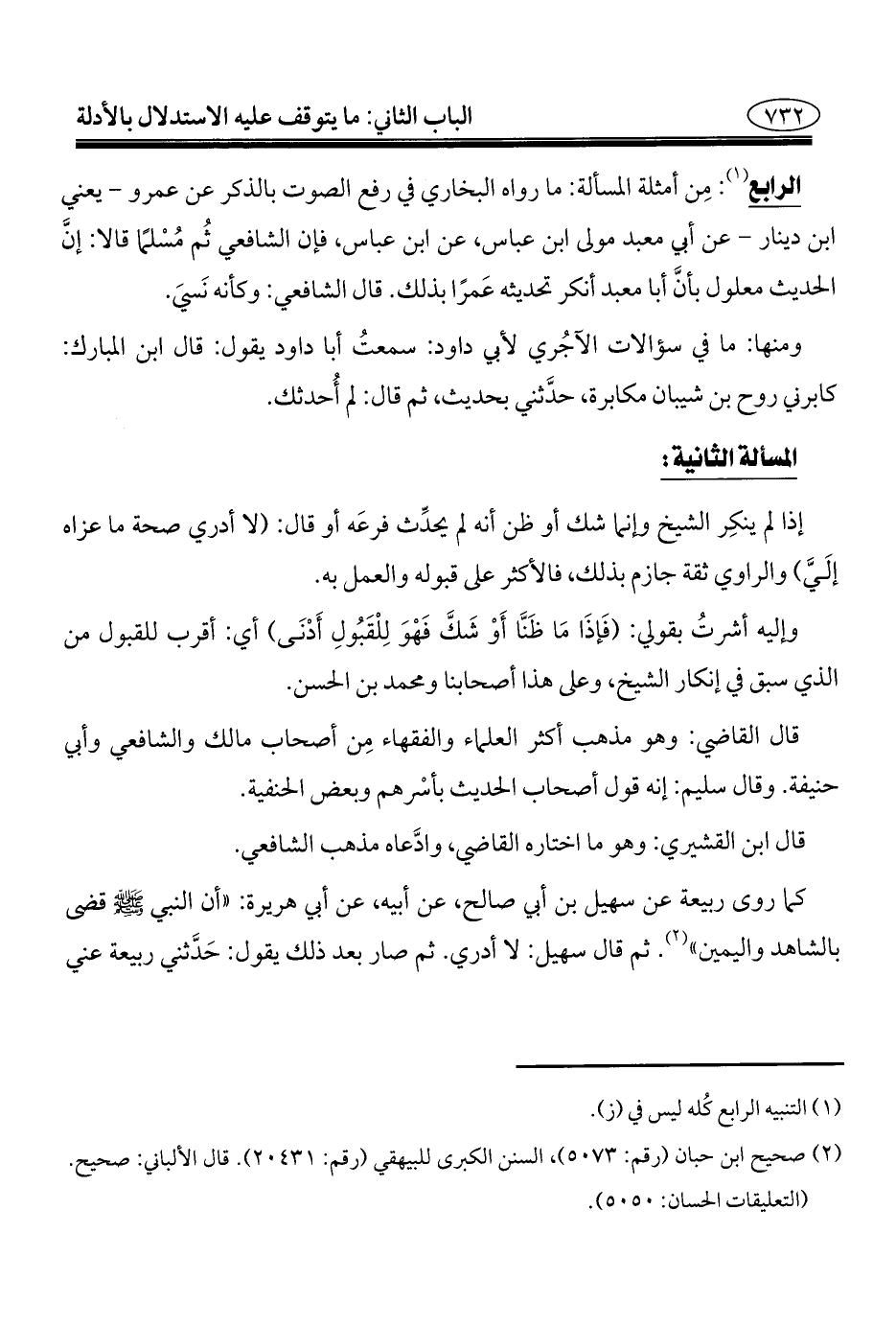 الرابع (¬١): مِن أمثلة المسألة: ما رواه البخاري في رفع الصوت بالذكر عن عمرو - يعني ابن دينار - عن أبي معبد مولى ابن عباس، عن ابن عباس، فإن الشافعي ثُم مُسْلمًا قالا: إنَّ الحديث معلول بأنَّ أبا معبد أنكر تحديثه عَمرًا بذلك. قال الشافعي: وكأنه نَسيَ.