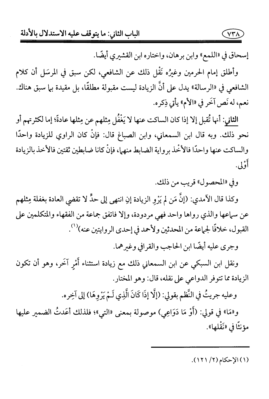 الثاني: أنها تُقبل إلا إذا كان الساكت عنها لا يَغْفُل مِثلهم عن مِثلها عادةً؛ إما لكثرتهم أو نحو ذلك. وبه قال ابن السمعاني، وابن الصباغ قال: فإنْ كان الراوي للزيادة واحدًا والساكت عنها واحدًا فالأخْذ برواية الضابط منهما، فإنْ كانا ضابطين ثقتين فالأخذ بالزيادة أَوْلى.