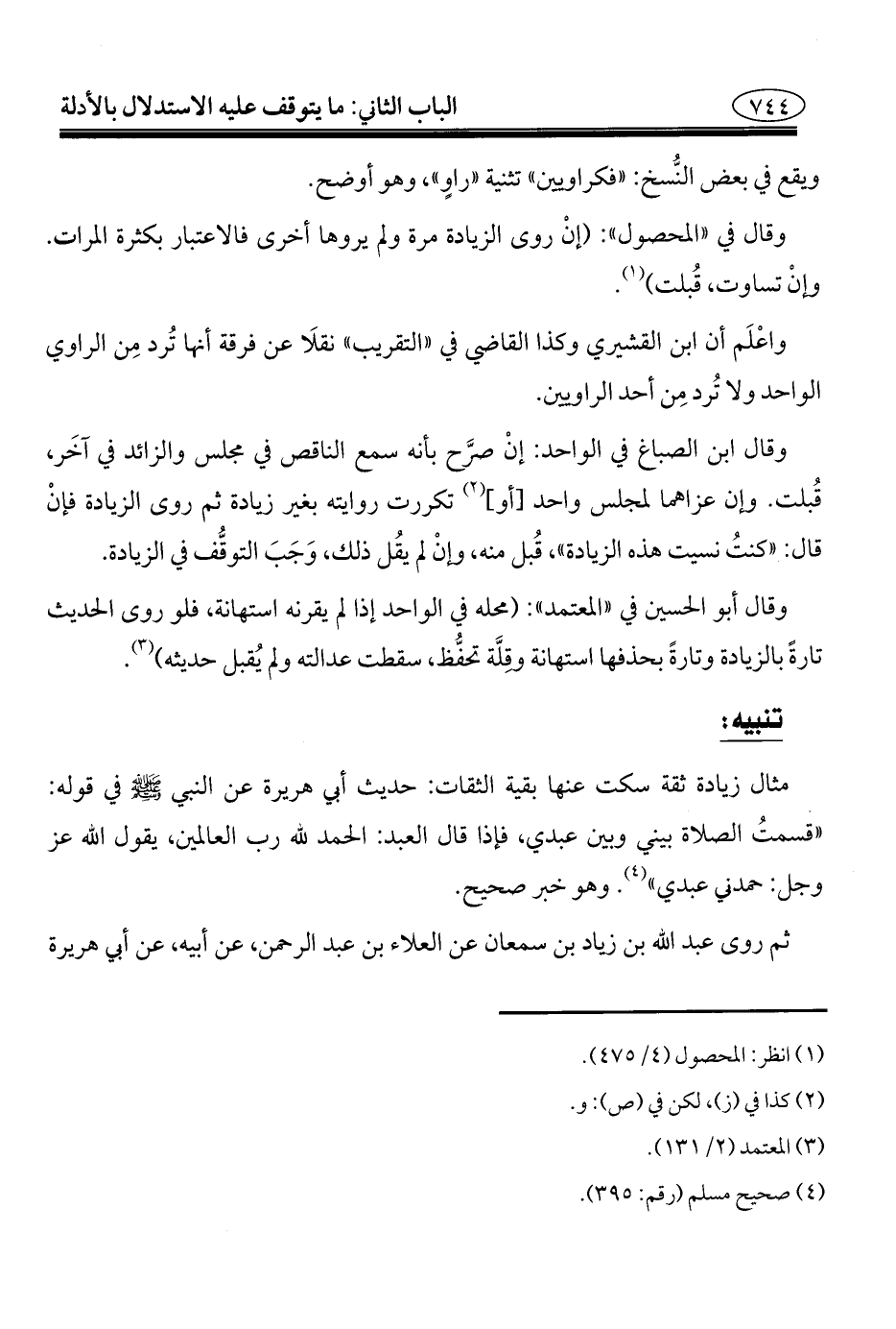 مثال زيادة ثقة سكت عنها بقية الثقات: حديث أبي هريرة عن النبي - صلى الله عليه وسلم - في قوله: "قسمتُ الصلاة بيني وبين عبدي، فإذا قال العبد: الحمد لله رب العالمين، يقول الله عز وجل: حمدني عبدي" (¬٤). وهو خبر صحيح.