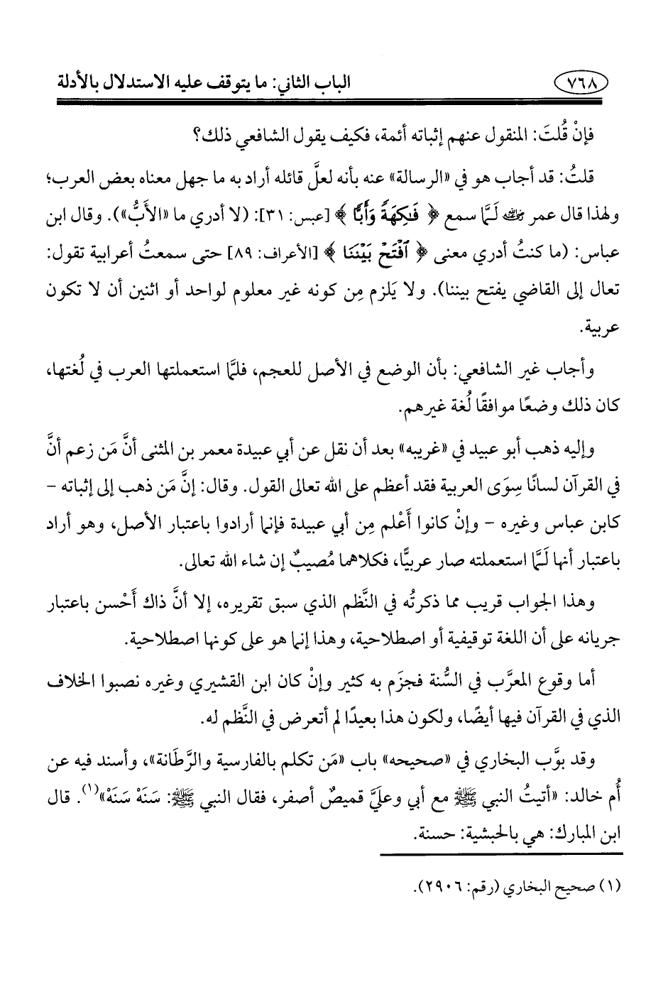وقد بوَّب البخاري في "صحيحه" باب "مَن تكلم بالفارسية والرَّطَانة"، وأسند فيه عن أُم خالد: "أتيتُ النبي - صلى الله عليه وسلم - مع أبي وعلَيَّ قميصٌ أصفر، فقال النبي - صلى الله عليه وسلم -: سَنَهْ سَنَهْ" (¬١). قال ابن المبارك: هي بالحبشية: حسنة.