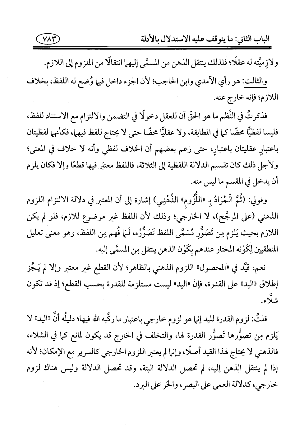 نعم، قيَّد في "المحصول" اللزوم الذهني بالظاهر؛ لأن القطع غير معتبر وإلا لم يَجُز إطلاق "اليد" على القدرة، فإن "اليد" ليست مستلزمة للقدرة بحسب القطع؛ إذ قد تكون شلَّاء.