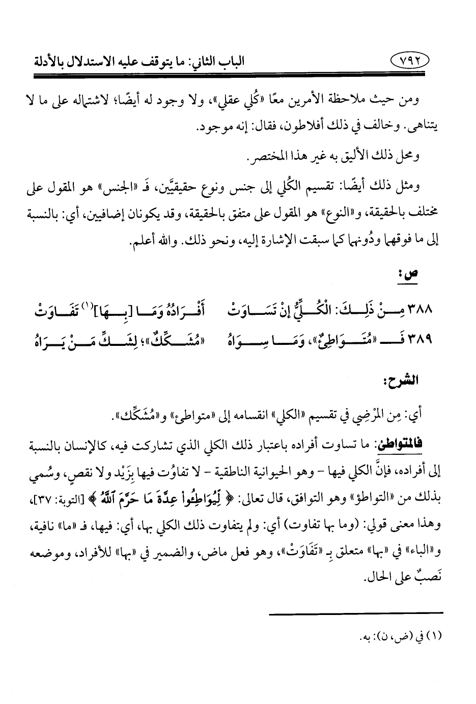 ٣٨٨ - مِنْ ذَلِكَ: الْكُلِّيُّ إنْ تَسَاوَتْ ... أَفْرَادُهُ وَمَا [بِهَا] (¬١) تَفَاوَتْ