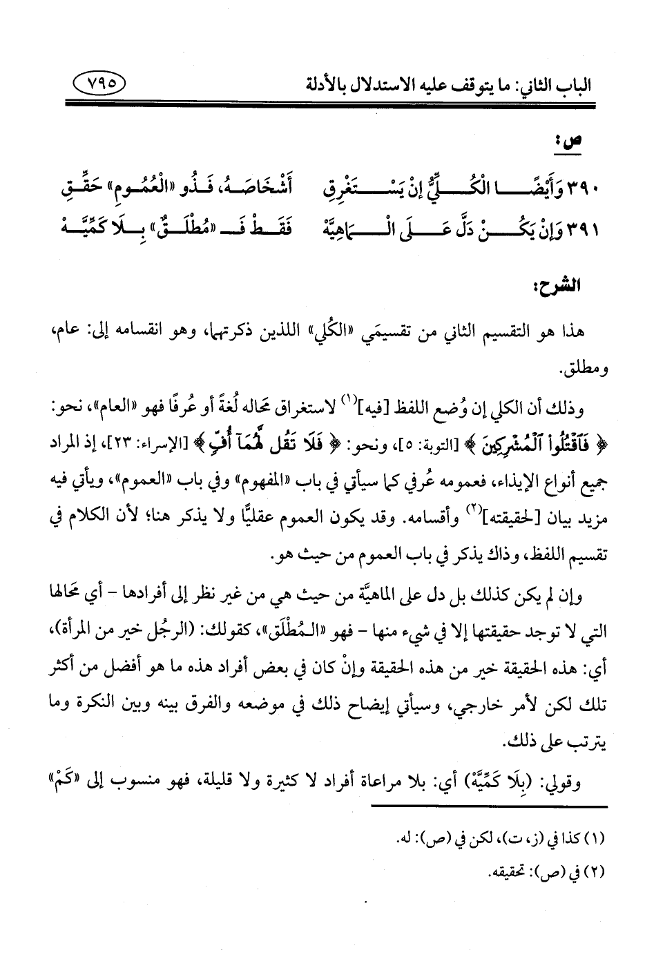 ٣٩٥ - وَأَيْضًا الْكُلِّيُّ إنْ يَسْتَغْرِقِ ... أَشْخَاصَهُ، فَذُو " الْعُمُومِ " حَقِّقِ
