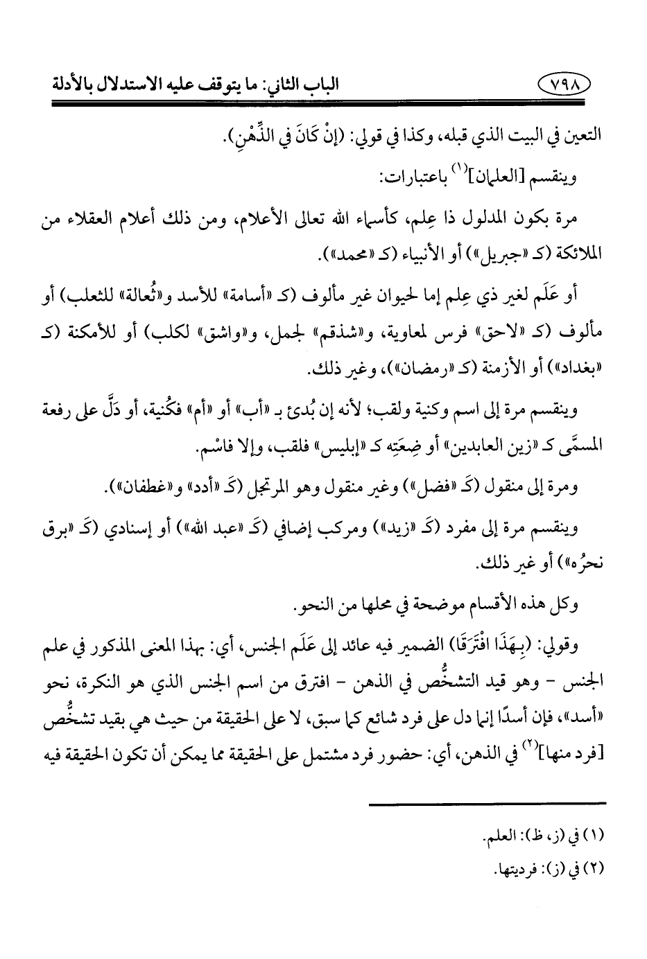 وينقسم [العلمان] (¬١) باعتبارات: مرة بكون المدلول ذا عِلم، كأسماء الله تعالى الأعلام، ومن ذلك أعلام العقلاء من الملائكة (ك "جبريل") أو الأنبياء (ك "محمد").