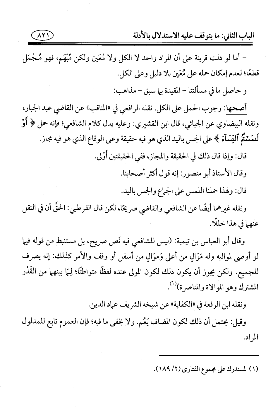 وقال أَبو العباس بن تيمية: (ليس للشافعي فيه نَص صريح، بل مستنبط من قوله فيما لو أوصى لمواليه وله مَوَالٍ من أعلى وَموَالٍ من أسفل أو وقف والأمر كذلك: إنه يصرف للجميع. ولكن يجوز أن يكون ذلك لكون المولى عنده لفظًا متواطئًا؛ لِمَا بينهما من القَدْر المشترك وهو الموالاة والمناصرة) (¬١).