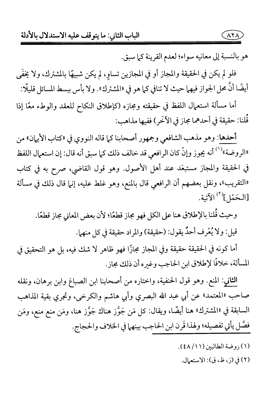 فلو لم يكن في الحقيقة والمجاز أو في المجازين تساوٍ، لم يكن شبيهًا بالمشترك، ولا يخفَى أيضًا أن محل الجواز فيهما حيث لا تنافي كما هو في "المشترك". ولا بأس ببسط المسائل قليلًا: